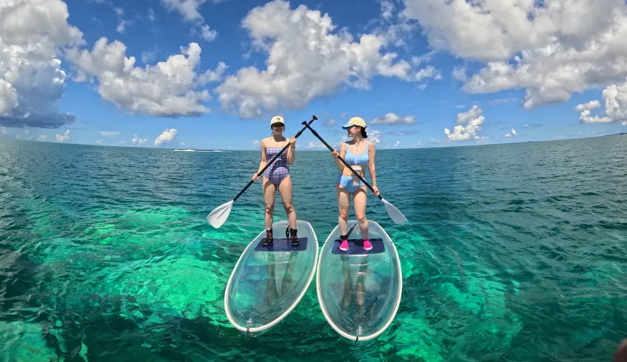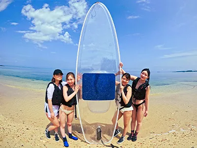クリアサップとは、透明(Clear)のボードを使ってSUP(スタンドアップパドルボード)をするマリンスポーツになります。海の上を優雅に進むSUPの楽しさはもちろん、シュノーケリングやダイビングとは違い、