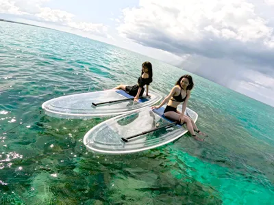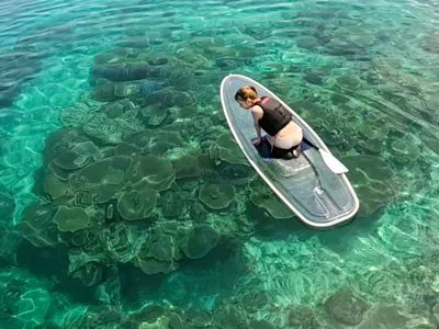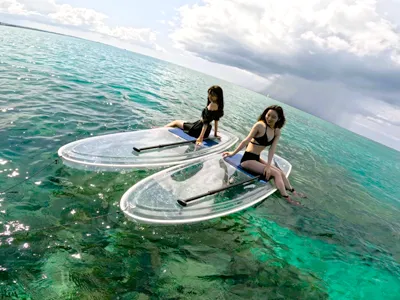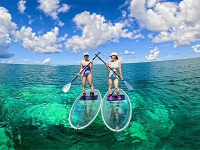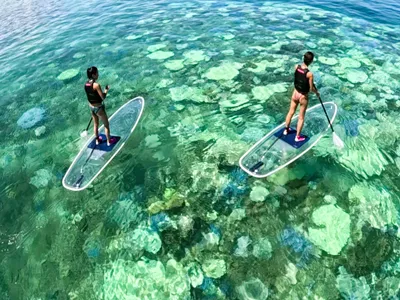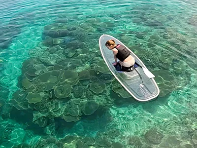 青の洞窟のシュノーケリングと透明のボード「クリアサップ」のお得なセットです。高性能カメラで体験中の撮影付きです。