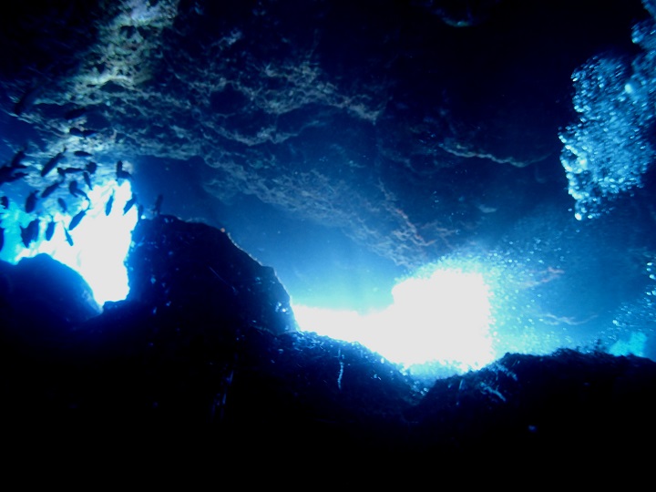 水中から水面を見ると、岩の切れ目がまぶしい位の明るさです。