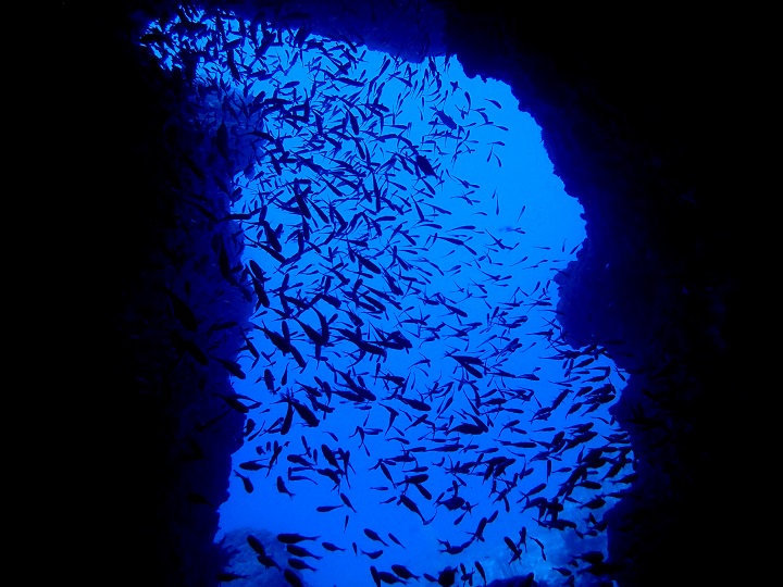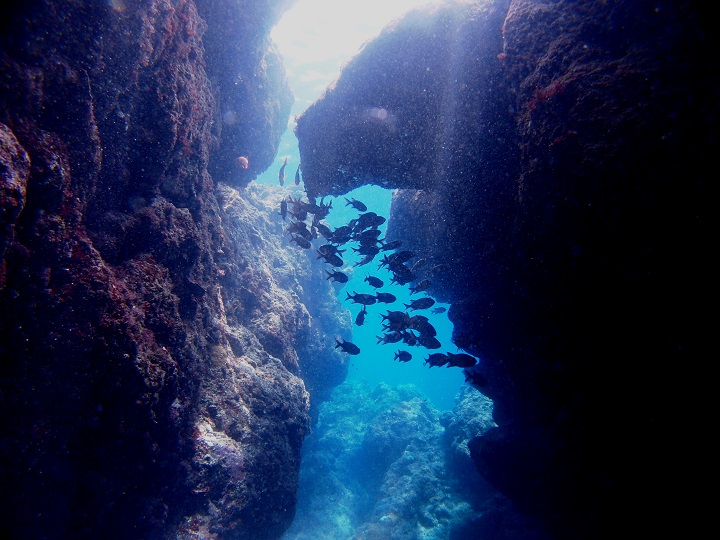 水中と言う特殊な環境の中に有る洞窟や岩の切れ目は、時にとても神秘的な光景を作り出すものです。