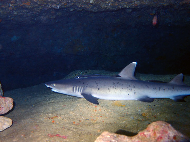 写真のサメは、ネムリブカ(英名はホワイトチップシャーク)と言って、昼間は岩陰で寝ている事が多いサメです。