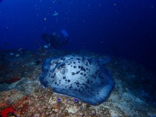 写真の後ろにいるダイバーと比べるとこのエイの大きさが伝わりますかね(*´ω`*)?