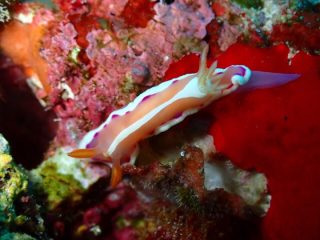 赤紫色をした背中は白い縁で覆われていて、体の中心には触角から二次鰓にかけて白く太いラインがあるのが特徴です。
