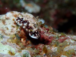レア度こそ低めですが、白と黒のシンプルな配色に緑色の鰓が鮮やかで個人的にはとても好きなウミウシです。