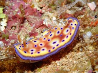 黄色い背中に紫色の斑点があり、縁も紫で囲われていて色鮮やかで派手な見た目のウミウシです。