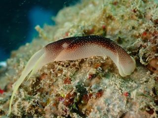 体は半透明の白色で背中井かけて黒くなっていきます。これは僕の推測ですが、体に「粉雪」を振りかけたような模様をしているところから「コナユキツバメガイ」という名前が付いたのではないかと思います。それにしても、ウミウシは姿・形の種類が豊富ですよね。このウミウシもぱっと見ウミウシには見えないですが、立派なウミウシの仲間で「ウミウシじゃないと思ってた」という事はよくあります。逆にウミウシだと思って必死に調べたら、実はウミウシではなく、ナマコの幼体だった、、、なんてこともありました。ウミウシの世界は奥が深い!!